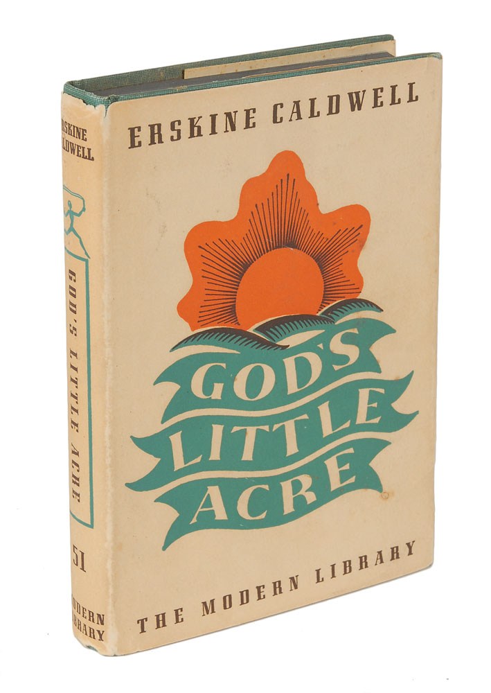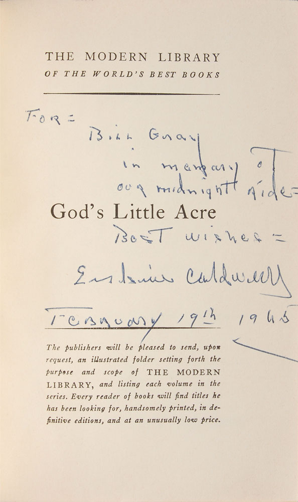 Signed book: God’s Little Acre. Later printing. NY: The Modern Library, 1933. Hardcover with dust jacket, 5 x 7.25, 303 pages. Signed and inscribed on the half-title page in blue ballpoint, “For: Bill Gray, in memory of our midnight ride—Best wishes—Erskine Caldwell February 19th 1965.” In fine condition. Pre-certified PSA/DNA.