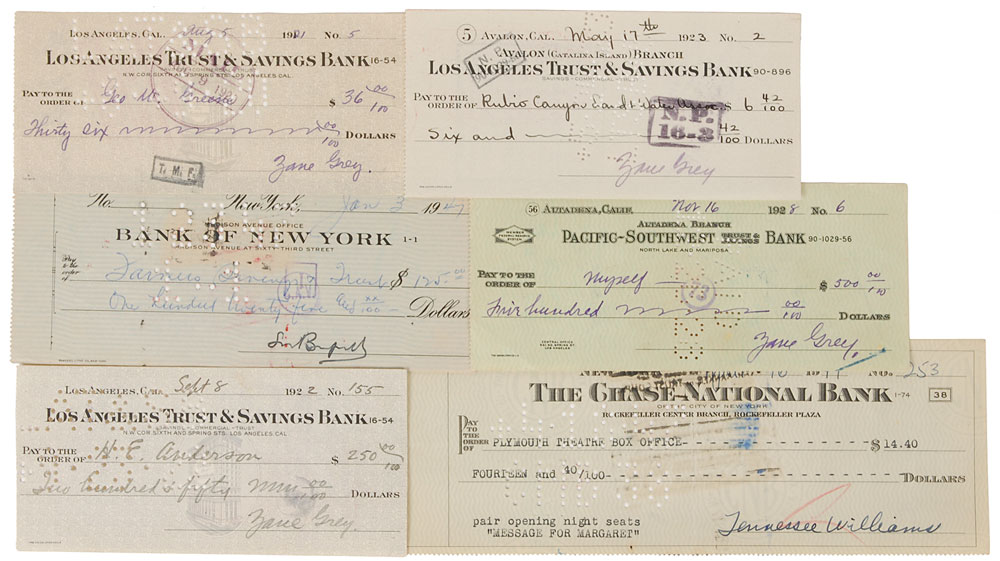 Collection of six checks signed by authors, including: Tennessee Williams, Louis Bromfield, and Zane Grey (4). In overall fine condition.