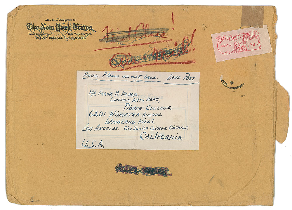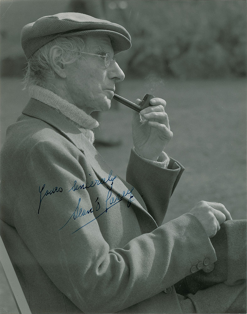 Rare pearl-finish 7.75 x 9.5 portrait of O’Casey smoking a pipe, signed in fountain pen, “Yours sincerely, Sean O’Casey.” In very good to fine condition, with scattered creases and a paperclip impression to the top edge. Accompanied by the original mailing envelope addressed in O’Casey’s hand, incorporating his surname in the return address on the reverse. The first example of an actual O’Casey signed photo we have offered. Pre-certified PSA/DNA.