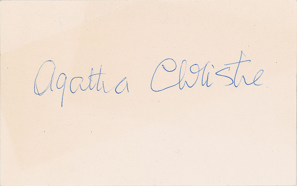 Ballpoint signature, “Agatha Christie,” on an off-white 5 x 3 card. Christie adds on the reverse, “Purely a mistake! No mystery.” In fine condition. Accompanied by the original mailing envelope, addressed in Christie’s own hand, postmarked September 26, 1972. Pre-certified PSA/DNA.