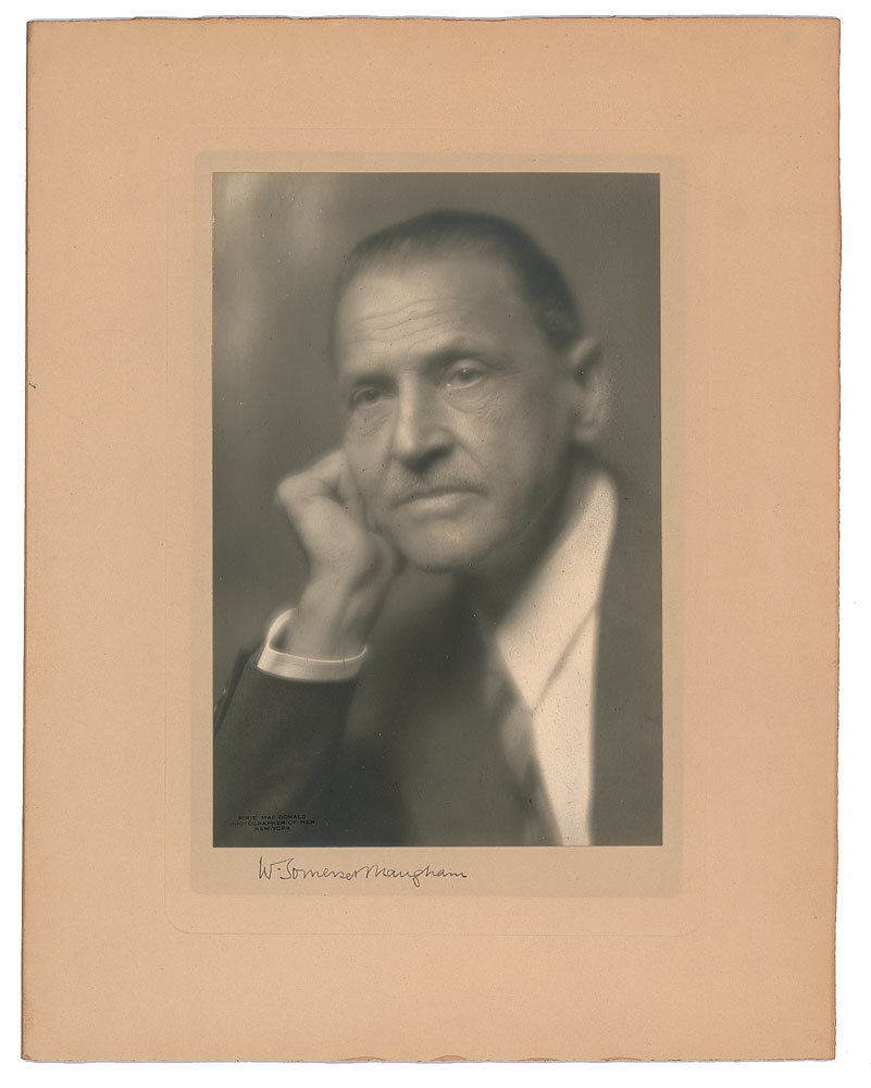 Exceptional vintage matte-finish 6 x 9 soft-focus portrait of Maugham by Pirie MacDonald of New York, affixed to its original 10.75 x 13.75 studio mount, signed on the mount in black ink. Reverse bears an ink notation dating the signature to June 2, 1947. In fine condition. Pre-certified PSA/DNA.