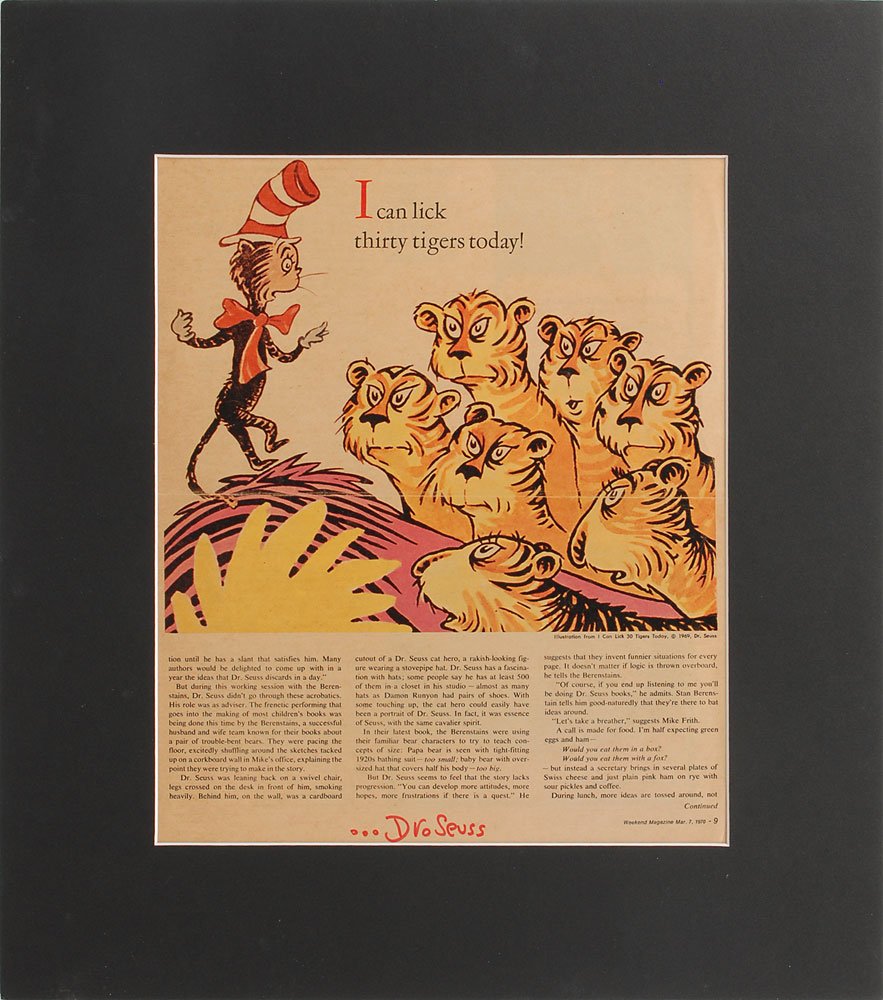 Page from a 1970 issue of Weekend Magazine, 9.75 x 12, featuring a color image of the Cat in the Hat looking at a group of tigers, signed at the bottom in red felt tip, “…Dr. Seuss.” Matted and in fine condition, with a central horizontal mailing fold. Pre-certified PSA/DNA.
