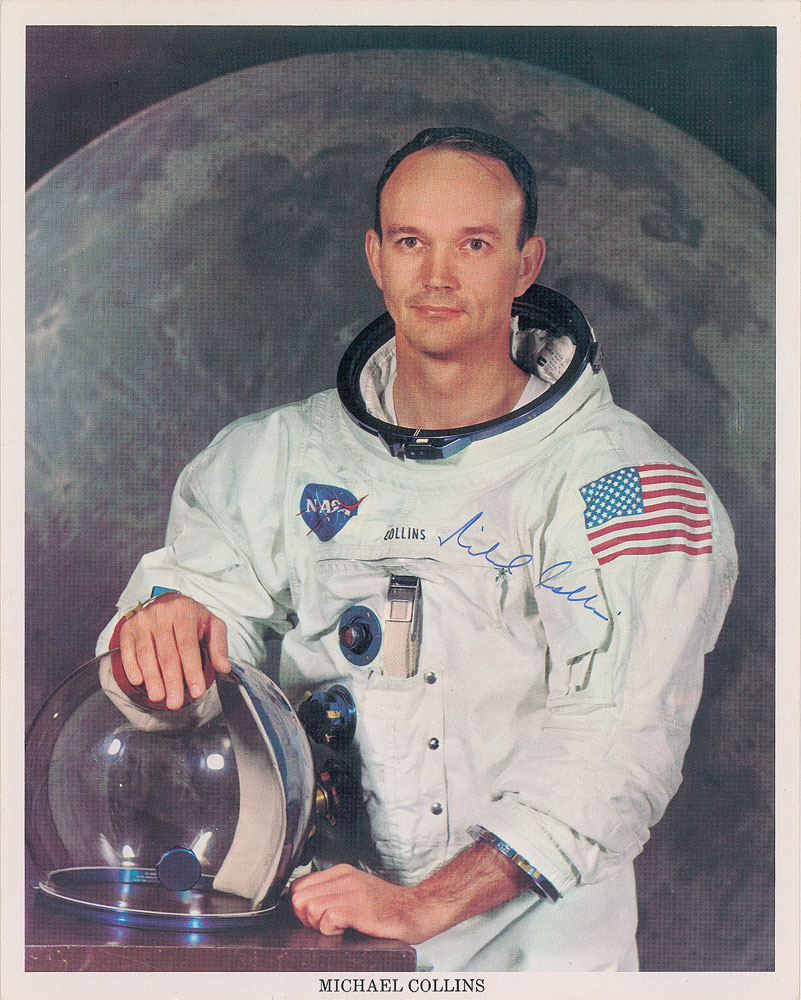 Official color 8 x 10 NASA lithograph of Collins posing in his white space suit against a lunar background, signed in blue ink. In fine condition. Pre-certified Zarelli Space Authentication.