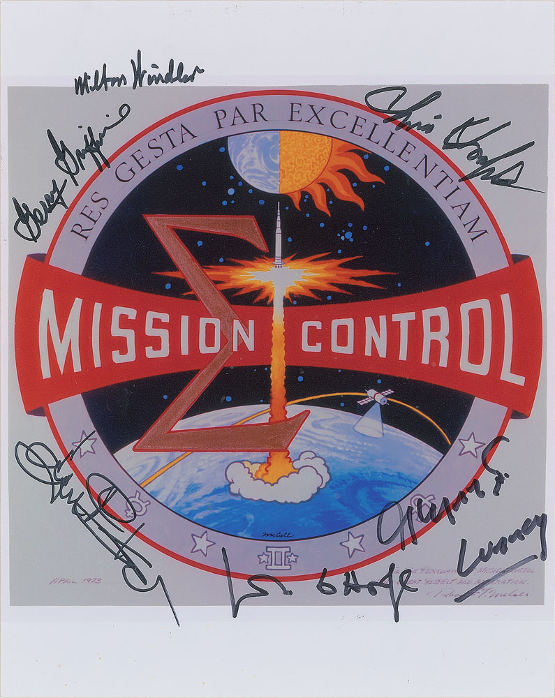 Color satin-finish 8 x 10 photo of the mission control insignia, signed in black felt tip by Milton Windler, Gerry Griffin, Chris Kraft, Gene Kranz, Glynn S. Lunney, and John Hodge. In fine condition, with some spotting blank borders. Pre-certified Zarelli Space Authentication.