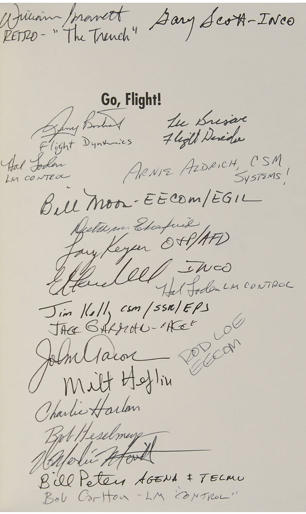 Signed book: Go, Flight!. First edition. Lincoln, NE: University of Nebraska, 2015. Hardcover with dust jacket, 6.25 x 9.25, 341 pages. Signed on the half-title page in black ink and ballpoint by 20 members of NASA’s mission control, including: Lee Briscoe, Bill Moon, Arnie Aldrich, Bill Peters, Jim Kelly, Gary Scott, Milt Heflin, and Hal Loden (2). In fine condition. Pre-certified Zarelli Space Authentication.