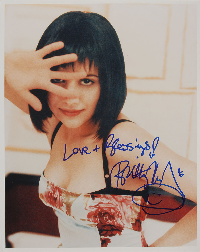 Attractive color glossy 8 x 10 photo of Murphy wearing a flowered dress, signed in blue felt tip, “Love & Blessings! Brittany Murphy,” adding a smiley face below. In fine condition.