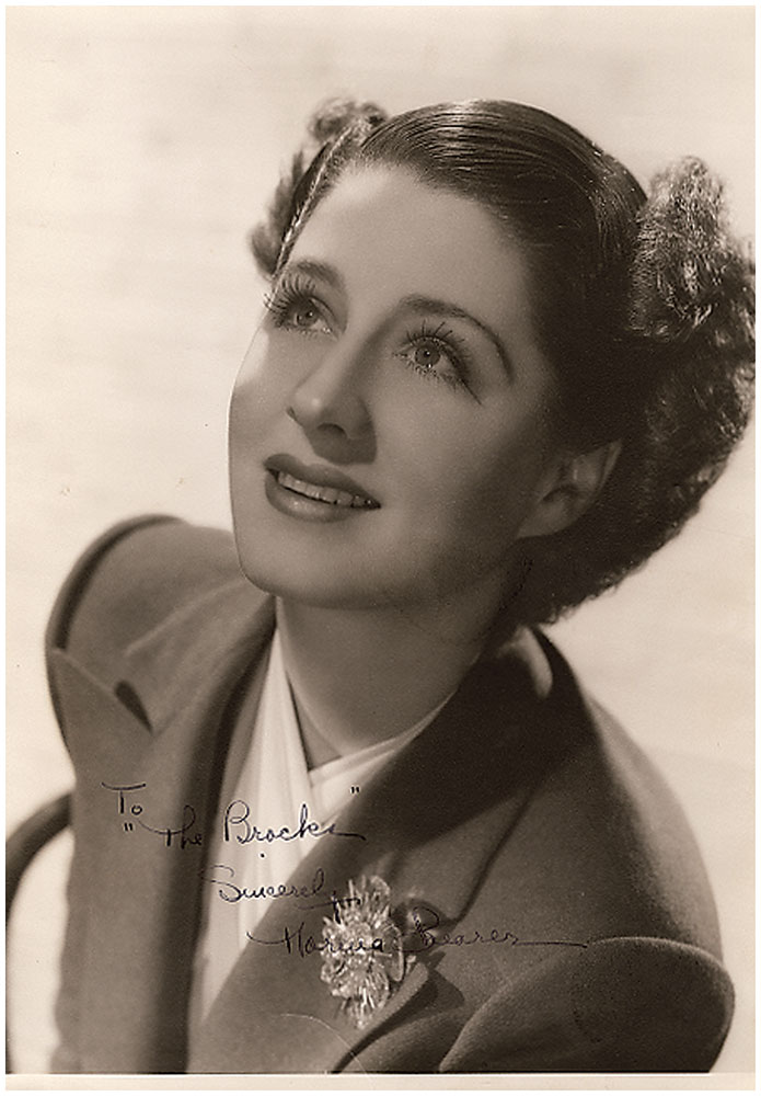 Lovely vintage matte-finish 9 x 12.75 publicity portrait of the young actress in an upward pose, signed and inscribed in fountain pen, “To ‘The Brocks,’ Sincerely, Norma Shearer.” Reverse bears an MGM photography stamp. In fine condition, with trimmed edges and areas of light irregularity to the surface. Pre-certified PSA/DNA.