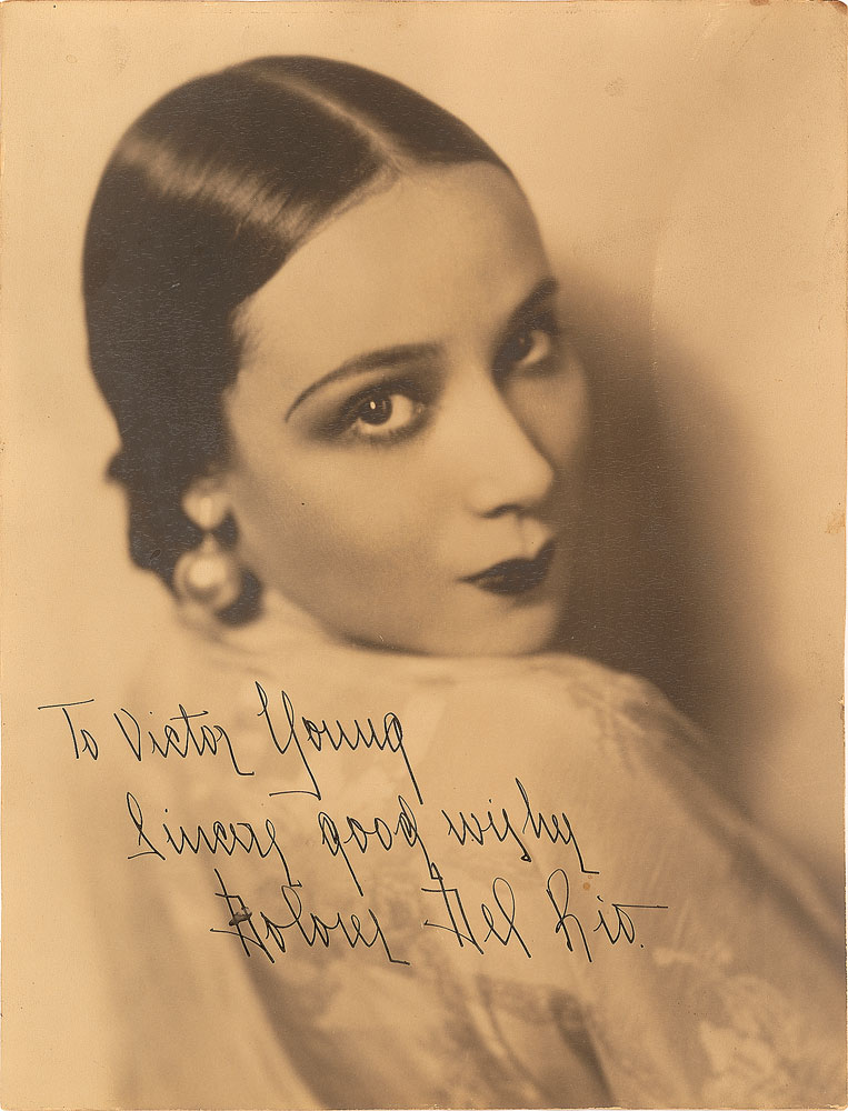 Gorgeous vintage sepia matte-finish 10.25 x 13.5 close-up portrait of the Mexican starlet glancing over her shoulder, prominently signed and inscribed in fountain pen, “To Victor Young, Sincere good wishes, Dolores Del Rio.” In very good to fine condition, with a few small, light stains. Pre-certified PSA/DNA.
