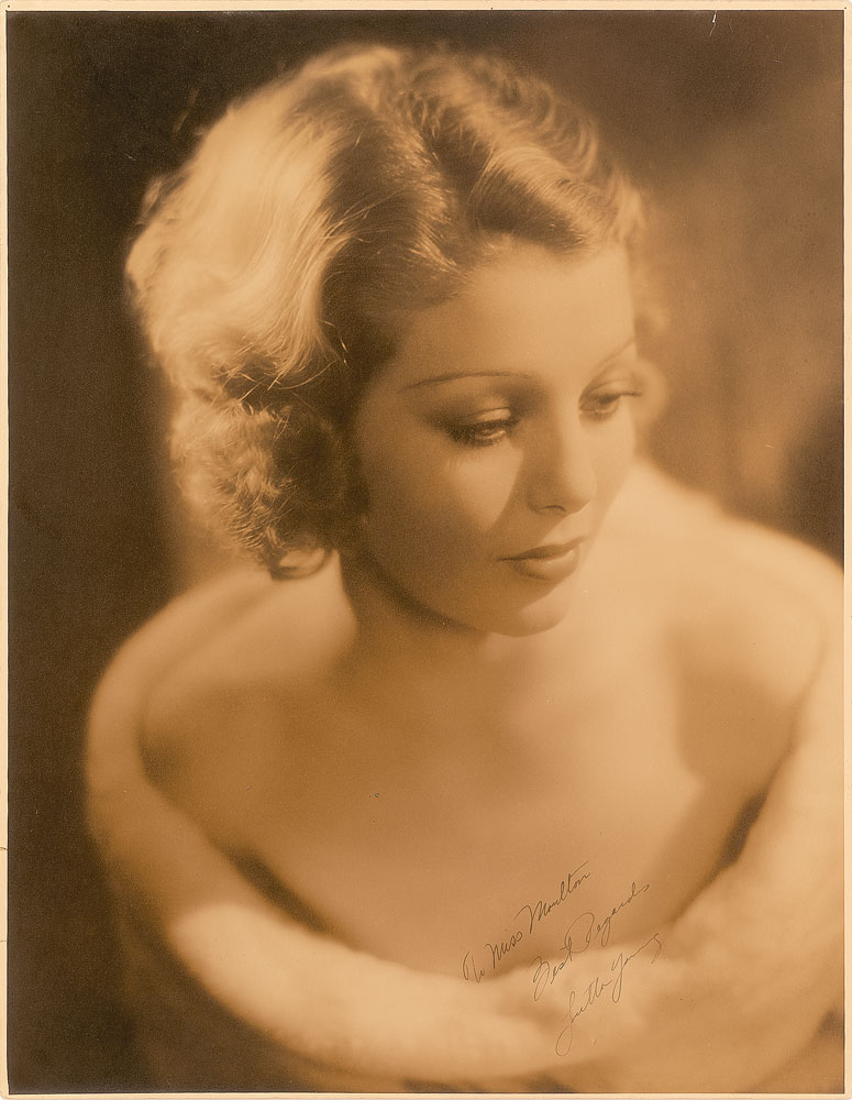 Elegant vintage sepia 10.5 x 13.5 glamour portrait of Young, signed and inscribed in black ink, “To Miss Moulton, Best Regards, Loretta Young.” Reverse bears an MGM photographer’s stamp. In fine condition, with a small tear to the top edge.