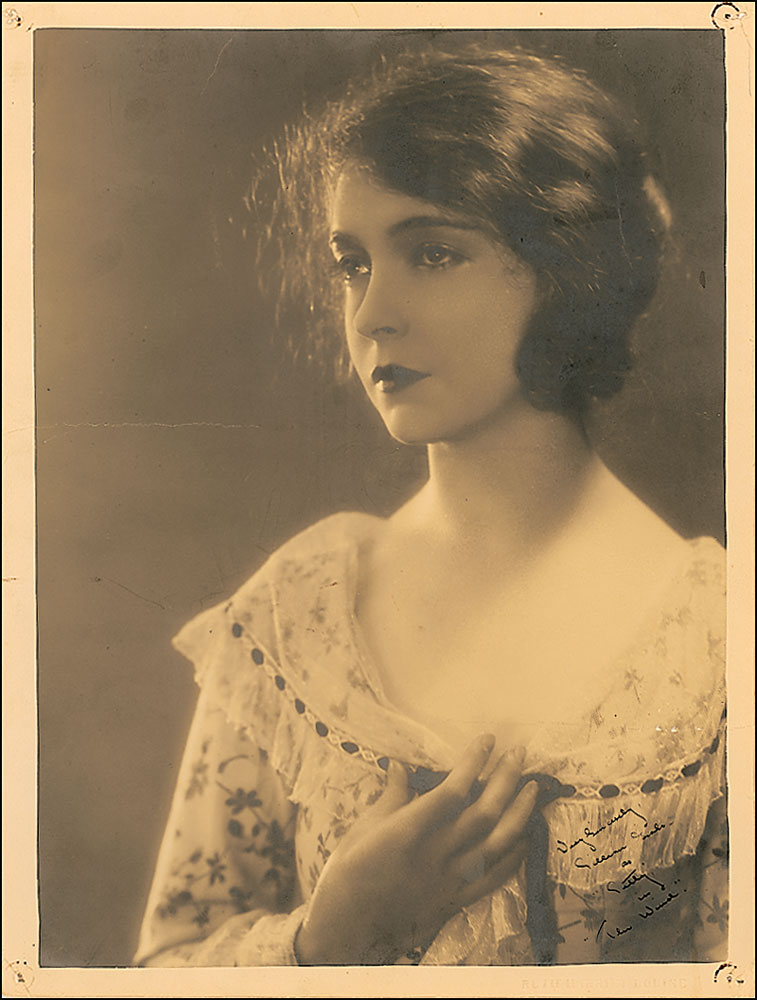 Vintage matte-finish 10 x 13.25 Ruth Harriet Louise portrait of Gish as the lead actress in the 1928 film The Wind, signed in fountain pen, “Very sincerely, Lillian Gish as ‘Letty,’ in ‘The Wind.’” Lower right corner bears the photographer’s blindstamp, with the reverse featuring an MGM/Louise stamp. In very good to fine condition, with a single tack hole to each corner and several noticeable light creases. Pre-certified PSA/DNA.