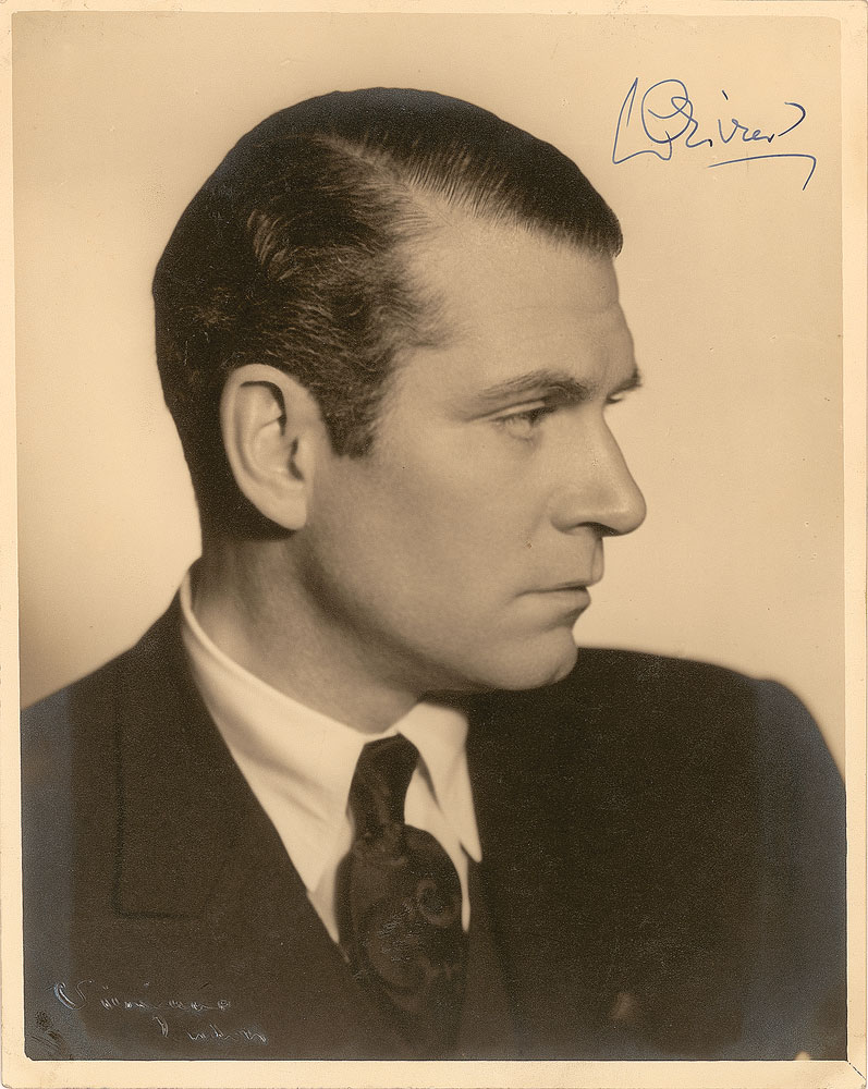 Vintage matte-finish 8 x 10 portrait of Olivier in near profile, signed in fountain pen, “L. Olivier.” Lower left corner bears a Vivienne of London blindstamp; reverse also stamped by the photography studio. In fine condition, with silvering to darker areas of the photo. Pre-certified PSA/DNA.