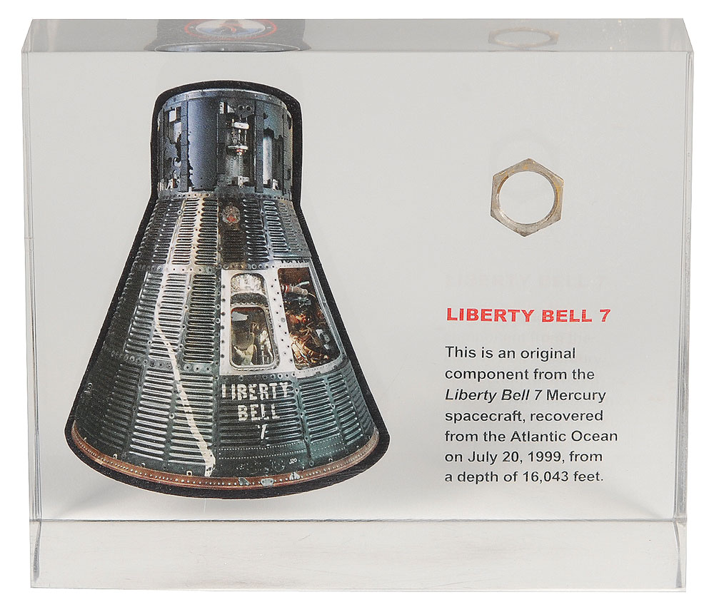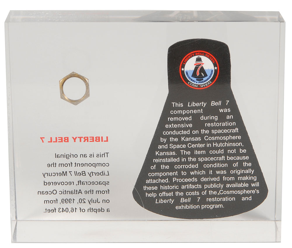 Flown original component from Gus Grissom’s Liberty Bell 7 Mercury spacecraft, recovered from the Atlantic Ocean on July 20, 1999. The piece measures approximately .5″ in diameter and is presented inside a 5.25 x 4.25 x 1.5 acrylic display with an image of the spacecraft as well as printed information about the recovery. In fine condition.