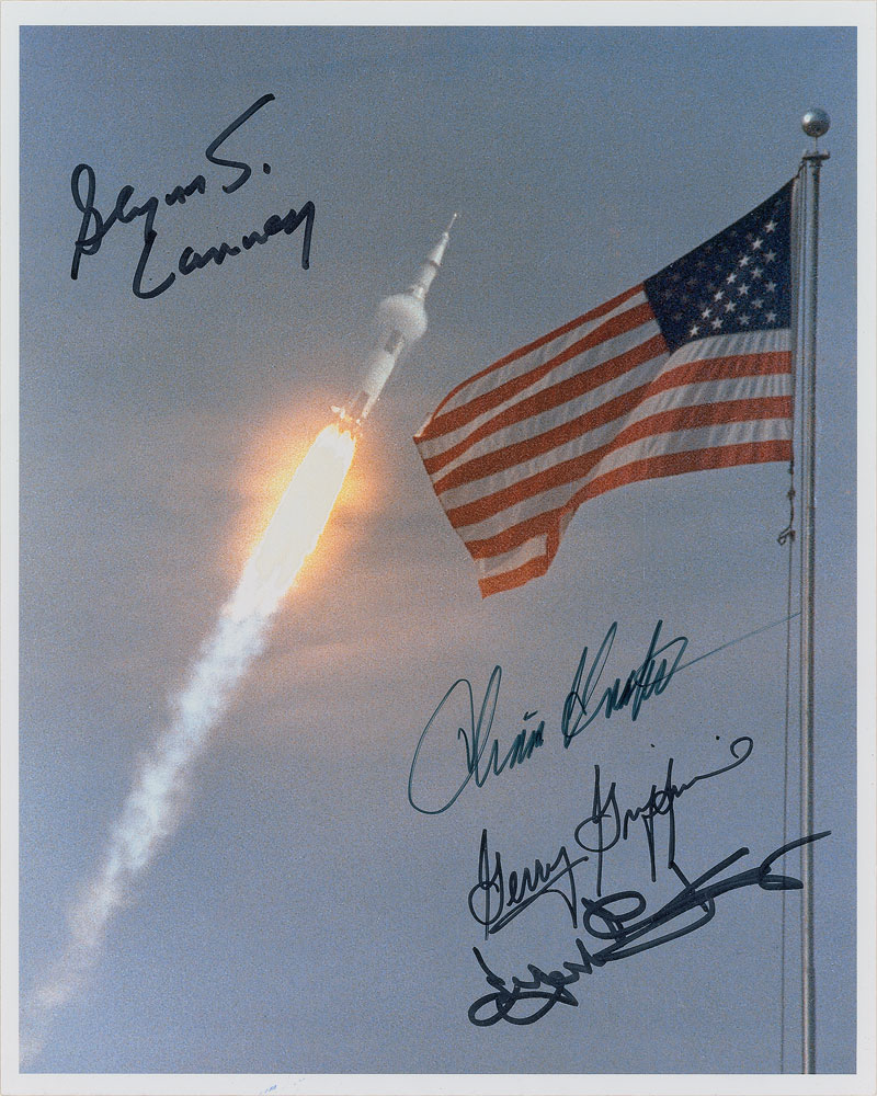Color satin-finish 8 x 10 photo of a launch with an American flag in the foreground, signed in black felt tip by Glynn S. Lunney, Chris Kraft, Gene Kranz, and Gerry Griffin. In fine condition, with a slightly grainy quality to the image. Pre-certified Zarelli Space Authentication.
