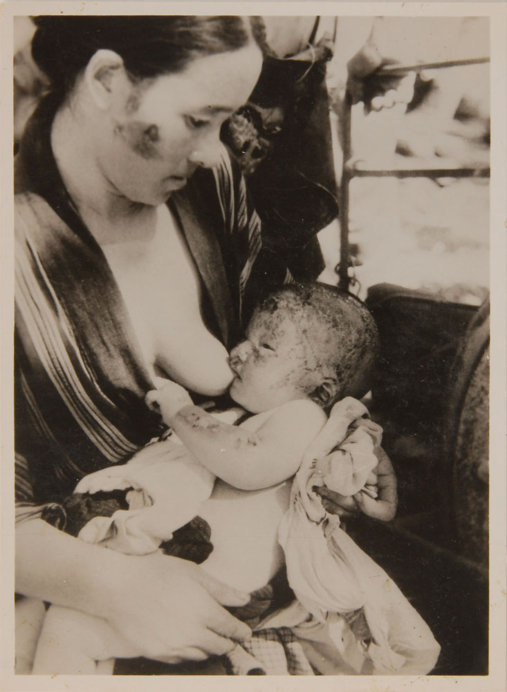 The photographs by Yamahata, which include twelve glossy and twelve matte-finish photos, show the immense destruction of buildings, vehicles, and the people of Nagasaki as a result of the atomic bomb. Two of the most famous images he took are present: one of a mother breastfeeding her child, which appeared in Life Magazine in 1952; and one of a young boy in a robe holding a rice ball, which was used as the cover image for the 1952 volume of Yamahata’s photographs entitled Atomized Nagasaki. This photo album also includes 'panoramas' of two pictures side to side as Yamahata intended. In overall very good to fine condition, with album disbound, some toned tape to corners of photographs, and a few areas of emulsion or surface loss. Due to the extreme and graphic content of some of these historic images we will not be posting these images either in this catalogue or on our website. However we will send all images to those interested in this lot.