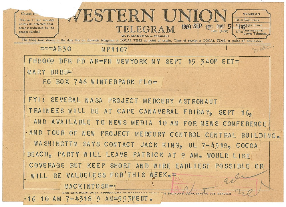 Two items: an original Western Union telegram addressed to longtime space program journalist Mary Bubb, one page, September 15, 1960, in part: “FYI: Several NASA Project Mercury astronaut trainees will be at Cape Canaveral Friday, Sept 16, and available to news media 10 AM for news conference and tour of new Project Mercury Control Central Building”; also includes an original vintage glossy 10 x 8 red-numbered NASA photo of the Mercury 7, bearing “A Kodak Paper” watermarks on the reverse. In overall very good to fine condition, with paper loss to one corner of the telegram. From the collection of aerospace memorabilia specialist Ken Havekotte.