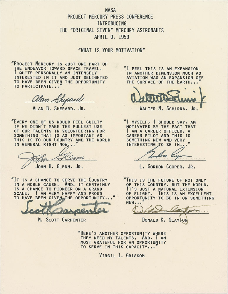 Souvenir typescript, one page, 8.5 x 11, signed in black felt tip and ballpoint by Alan Shepard, Wally Schirra, John Glenn, Gordon Cooper, Scott Carpenter, and Deke Slayton. An interesting typescript containing each of the astronauts’ responses to the question “What is your motivation?,” at the press conference introducing the original seven astronauts. In fine condition, with some haloing to signatures. An unusual format lending insight into each of the astronauts’ thought processes as they prepared to attempt manned spaceflight for the first time. From the collection of aerospace memorabilia specialist Ken Havekotte. Pre-certified Zarelli Space Authentication.