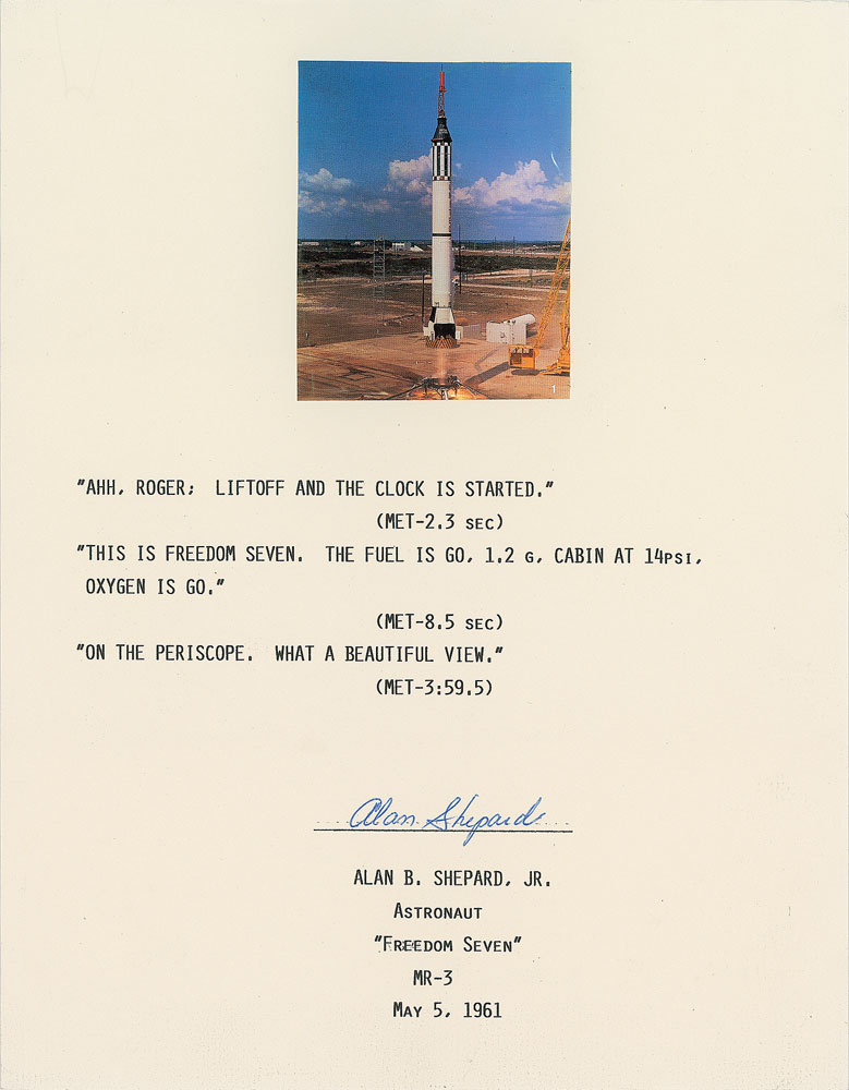 Souvenir typescript, one page, 8.5 x 11, signed in blue ballpoint, “Alan Shepard.” Typescript of the conversation between Shepard and Mission Control following the MR-3 liftoff, including the quote, “On the periscope. What a beautiful view.” A color image of the launch is affixed at the top. In fine condition. From the collection of aerospace memorabilia specialist Ken Havekotte. Pre-certified Zarelli Space Authentication.