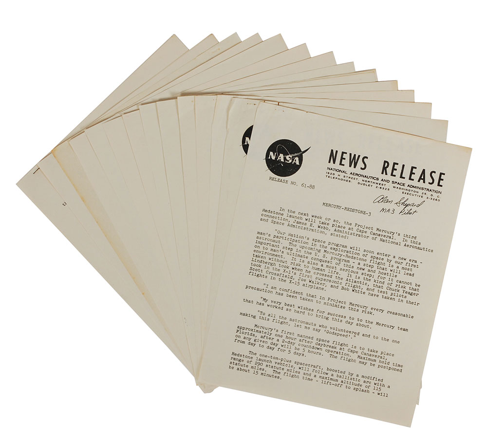 Original official NASA news release press kit for Mercury-Redstone 3, 38 pages, 8 x 10.5, April 26, 1961, signed on the cover sheet in black felt tip, “Alan Shepard, MR3 Pilot.” The press kit is divided into eleven sections detailing the first manned Mercury sub-orbital flight. In fine condition, with expected wear including a couple rusty paperclip marks. Consignor notes that this was signed at a private signing in the mid-1990s at the US Astronaut Hall of Fame in Titusville, Florida; this is the only known signed example of this press kit. From the collection of aerospace memorabilia specialist Ken Havekotte. Pre-certified Zarelli Space Authentication.