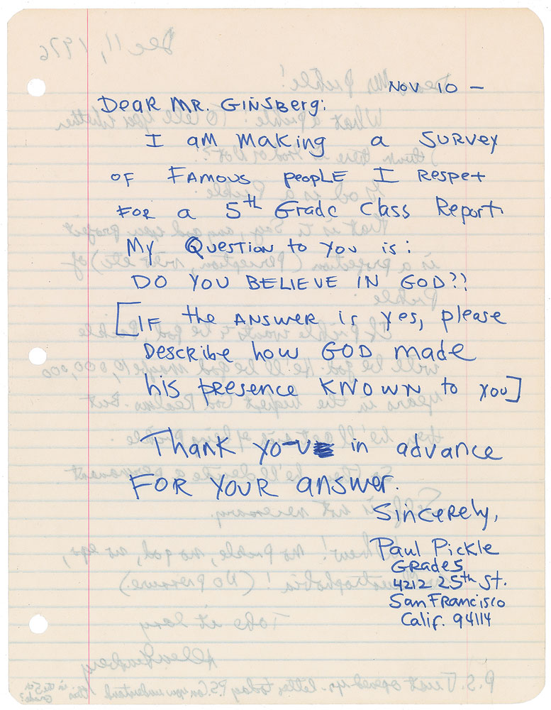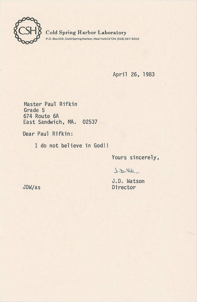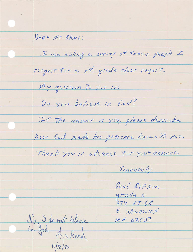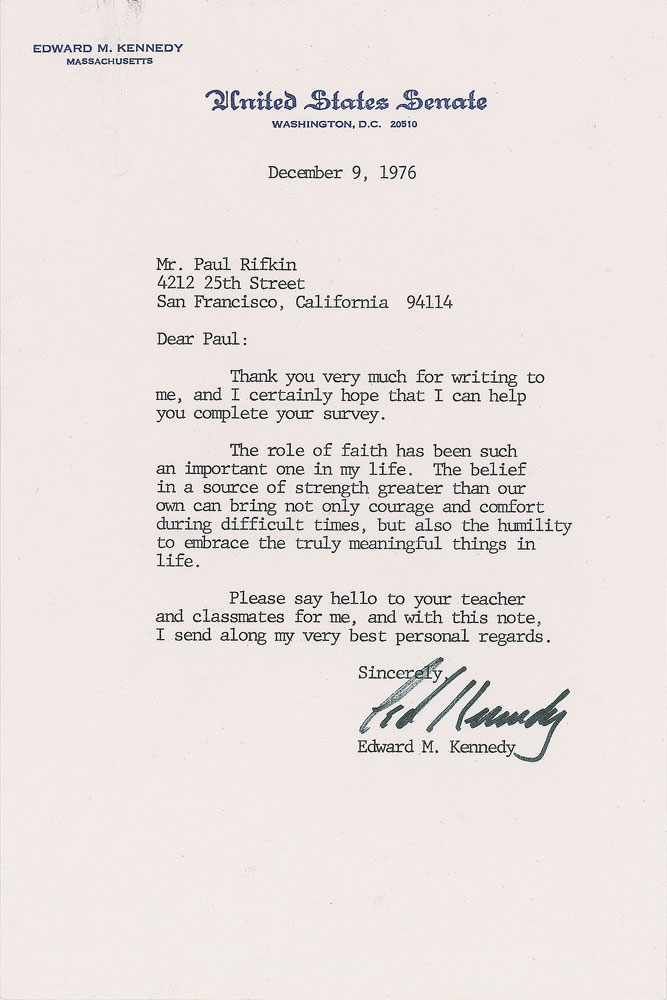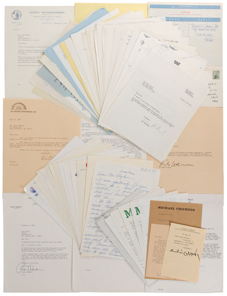 Remarkable collection of over 450 letters by celebrities and notable figures from a wide variety of fields, dated from 1976 to 1983, all written in response to the simple question: “Do you believe in God?” Represented within the collection are noteworthy actors, actresses, musicians, athletes, politicians, religious figures, scientists, businessmen, and more. The letters were compiled by Paul Rifkin, who wrote to prominent people posing as a fifth-grade student doing a school project. After receiving responses to his inquiry, he replied to reveal himself and ask for permission to publish their answers. With the approval of many respondents, Rifkin edited a compilation entitled The God Letters, published by Warner Books in 1986; a softcover copy of the book accompanies the collection. In overall very good to fine condition. Due to the large quantity a few other secretarial and/or printed signatures may be included. Interested parties are encouraged to view the collection in person at our offices or call us with specific inquiries, as this collection is sold as is and no returns will be accepted. A complete collection of images is available here: (A-D), (E-K), (L-Q), (R-Z).