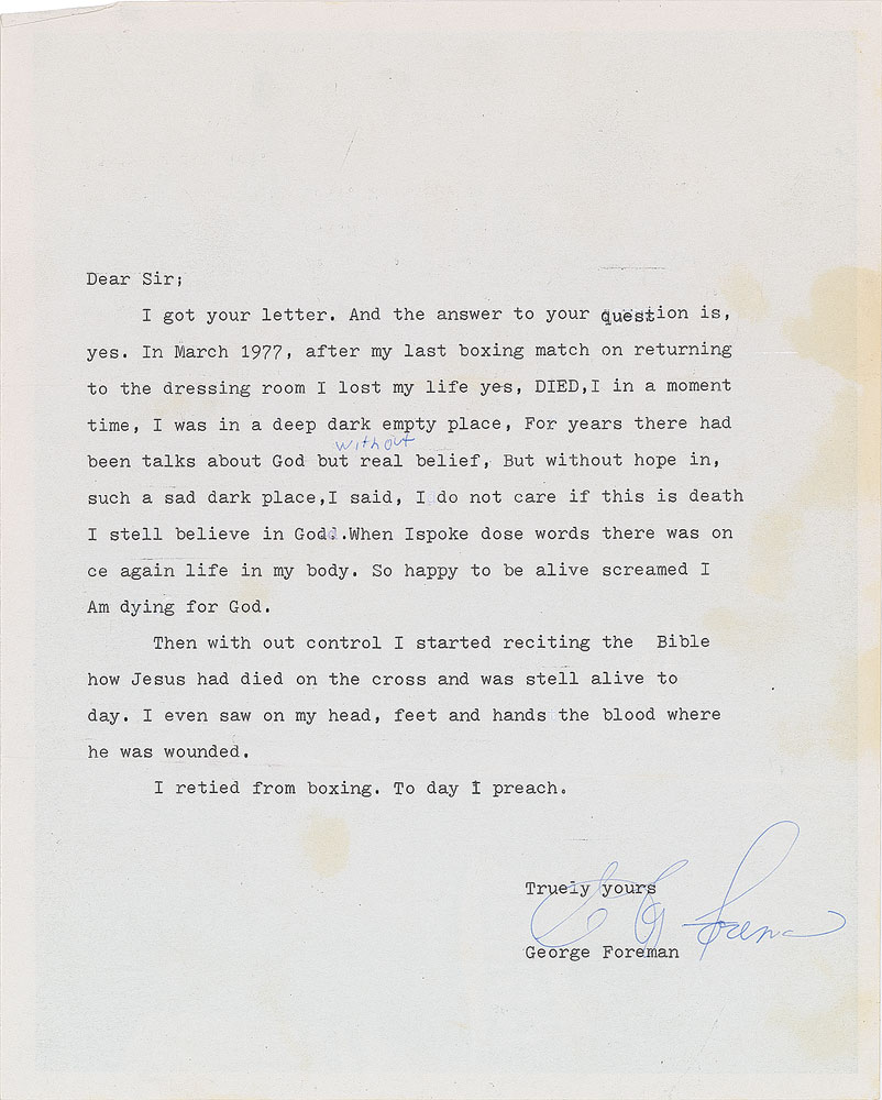 George Foreman: “After my last boxing match on returning to the dressing room I lost my life yes, DIED…I said, I do not care if this is death I stell believe in God. When I spoke dose words there was once again life in my body.”
