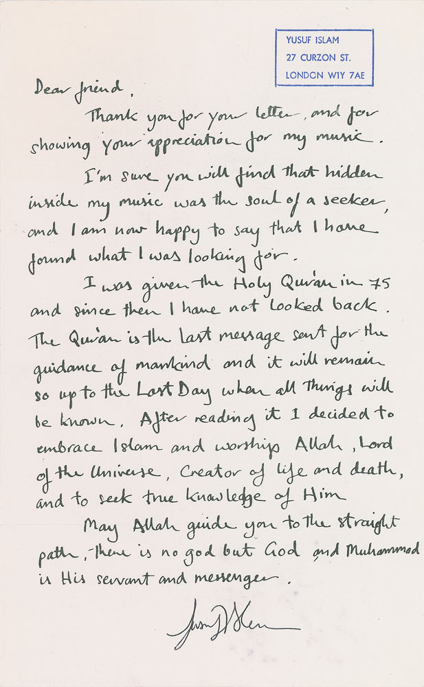 Cat Stevens, signed “Yusuf Islam”: “I’m sure you will find that hidden inside my music was the soul of a seeker, and I am now happy to say that I have found what I was looking for…I decided to embrace Islam and worship Allah, Lord of the Universe, Creator of life and death, and to seek true knowledge of Him.”