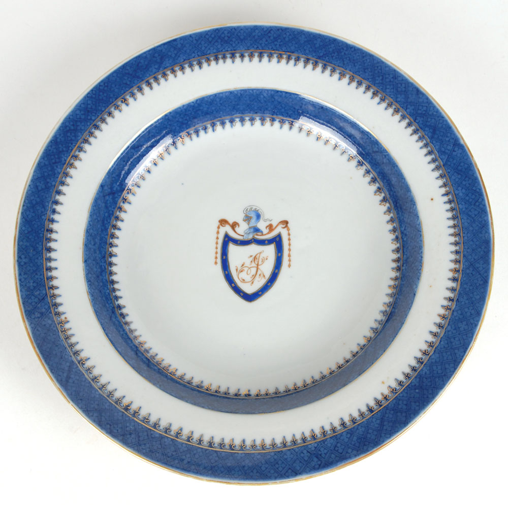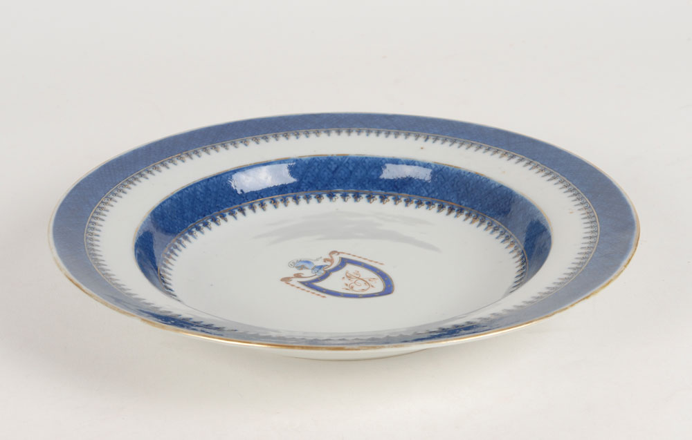Original Thomas Jefferson presidential china soup bowl. Beautiful china shallow soup bowl, circa 1790, is made of white Chinese porcelain, measures 9.5″ in diameter (the same as the Jefferson dinner plate), and is painted blue with gilt fleur-de-lis edges. Center of the bowl bears an exceptional hand-painted design featuring Jefferson’s neoclassical shield studded with 13 gold stars which encloses the script initial “J,” surmounted by a plumed knight’s helmet. In fine condition, with a removable Raleigh DeGeer Amyx Collection label affixed to bottom of bowl.