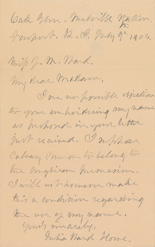 ALS, one page, 5 x 8, May 9, 1904. Letter to J. M. Ward, in full: “I see no possible objection to your embroidering my name as proposed in your letter just received. I suppose Calvary Church to belong to the Anglican persuasion. I will not however make this a condition regarding the use of my name.” In fine condition. Pre-certified PSA/DNA.