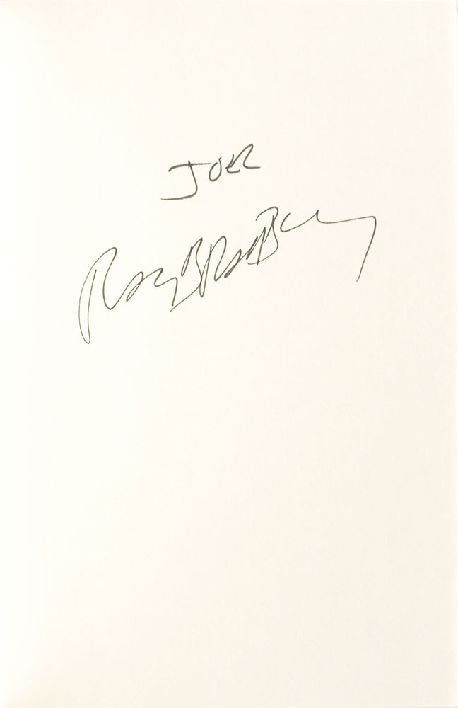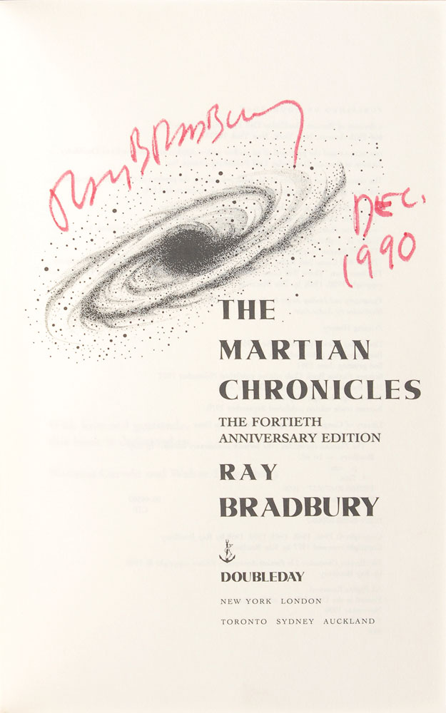 Three first edition books, each hardcover with dust jacket, and signed on an opening page in ink or felt tip by Bradbury, with two inscribed. Titles include: the 40th Anniversary Edition of The Martian Chronicles; Green Shadows, White Whale (ins); and Death Is a Lonely Business (ins). In overall fine condition. Pre-certified PSA/DNA.