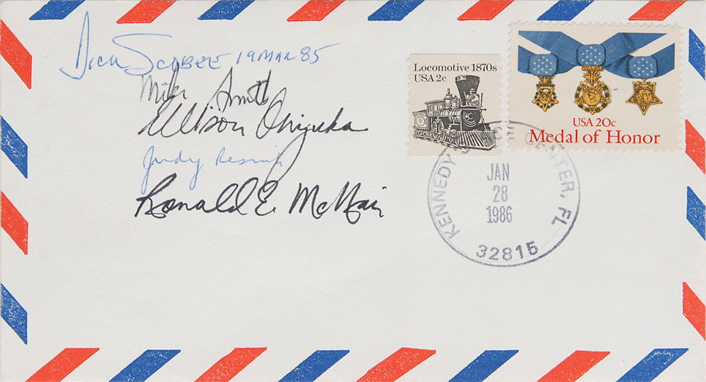 Postal cover postmarked Kennedy Space Center, January 28, 1986, the launch date of STS-51-L, signed in blue ballpoint, “Dick Scobee, 19 Mar 85” and “Judy Resnik,” and in black ink, “Mike Smith,” “Ellison Onizuka,” and “Ronald E. McNair.” In fine condition. Pre-certified Zarelli Space Authentication.