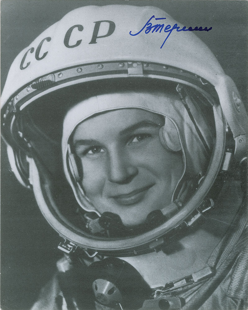 Semi-glossy 8 x 10 cardstock close-up photo of a smiling Valentina Tereshkova in her spacesuit, signed in blue felt tip. In fine condition. Pre-certified Zarelli Space Authentication.