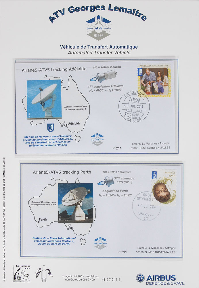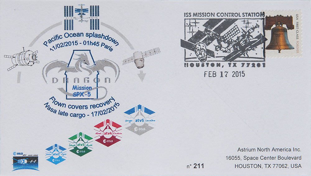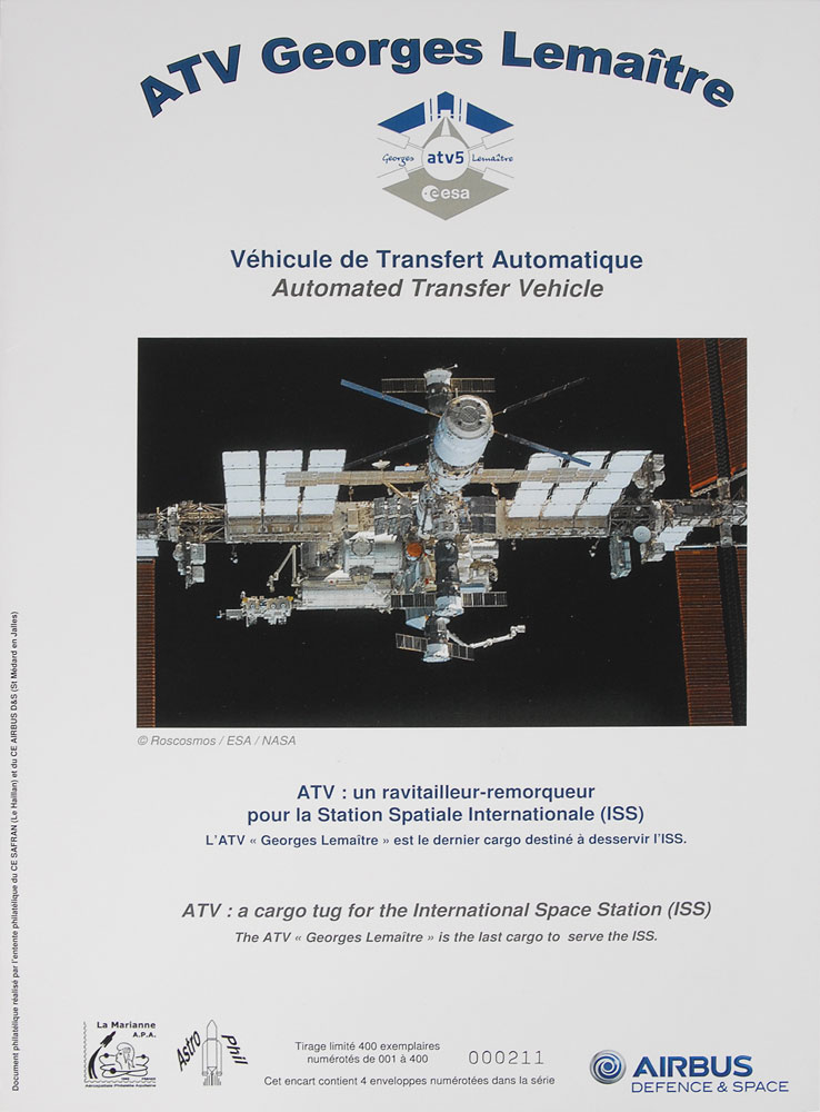 Flown postal cover carried to the International Space Station aboard the Georges Lemaître ATV cargo resupply spacecraft on July 28, 2014, and returned to Earth aboard the Dragon spacecraft during the SpaceX CRS-5 on February 11, 2015, numbered 211/400, housed in its original Airbus Defence & Space folder. Includes five other unflown covers related to the ATV and SpaceX spacecraft. In fine condition.