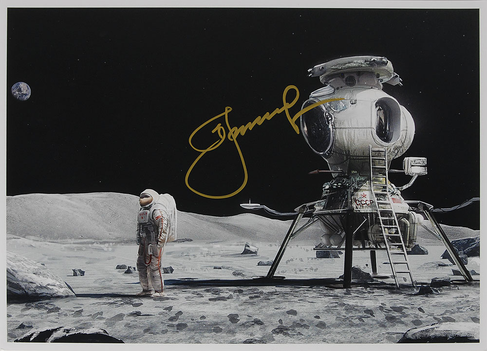 Appealing color satin-finish 10 x 8 photo of conceptual artwork showing a cosmonaut standing on the lunar surface, signed in gold ink by Alexei Leonov. In fine condition. Accompanied by a certificate of authenticity from Spaceflori. Pre-certified Zarelli Space Authentication.