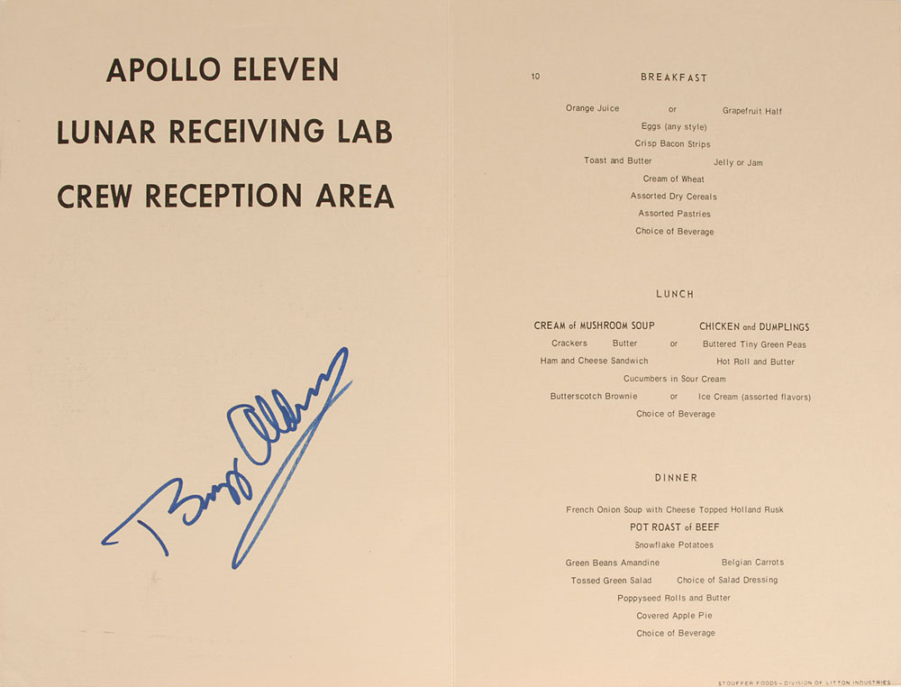 Attractive Apollo 11 lunar receiving lab menu for the crew reception area, 7.5 x 11, boldly signed on the inside front cover in blue felt tip by Aldrin. Printed by Stouffer Foods—Division of Litton Industries. In fine condition. Pre-certified Zarelli Space Authentication.