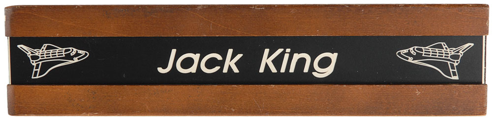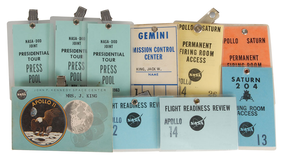 Kennedy Space Center Chief of Public Information during projects Mercury, Gemini and Apollo (1931–2015) who provided public announcements and commentary for several of the mission launches, including the announcement of the Apollo 11 launch, which earned him the nickname ‘Voice of Apollo.’ Collection of ten laminated access badges issued to Jack King, a former Chief of Public Information and Public Affairs Officer for NASA, including: a Gemini Mission Control Center badge; an Apollo 11 launch certificate, numbered 9638; Firing Room Access badges for Apollo 12, 13, and 14; Flight Readiness Review badges for Apollo 12 and 14; and three NASA–DOD Presidential Tour Press Pool badges, each dated November 16, 1963. Also includes King’s engraved desk name block. In overall very good to fine condition. Originating from the Astronaut Scholarship Foundation, a portion of the proceeds for the sale of this item will be donated to the ASF.