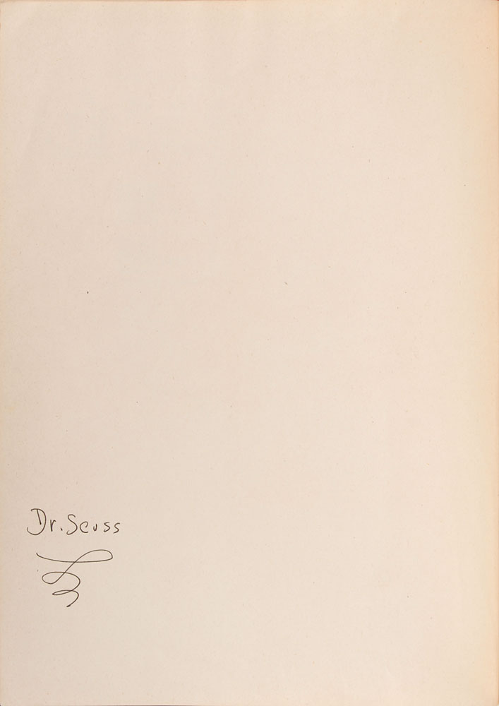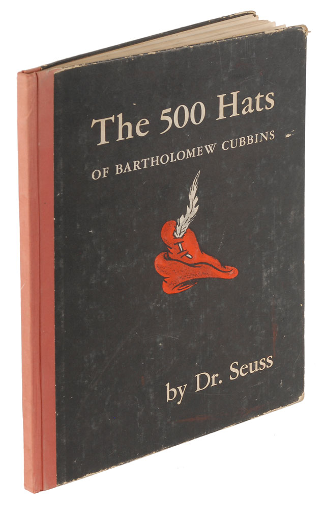 Signed book: The 500 Hats of Bartholomew Cubbins. First edition, later printing. NY: The Vanguard Press, 1938. Hardcover, 9 x 12. Signed opposite the title page in black ink, "Dr. Seuss." Autographic condition: fine. Book condition: VG-/None.