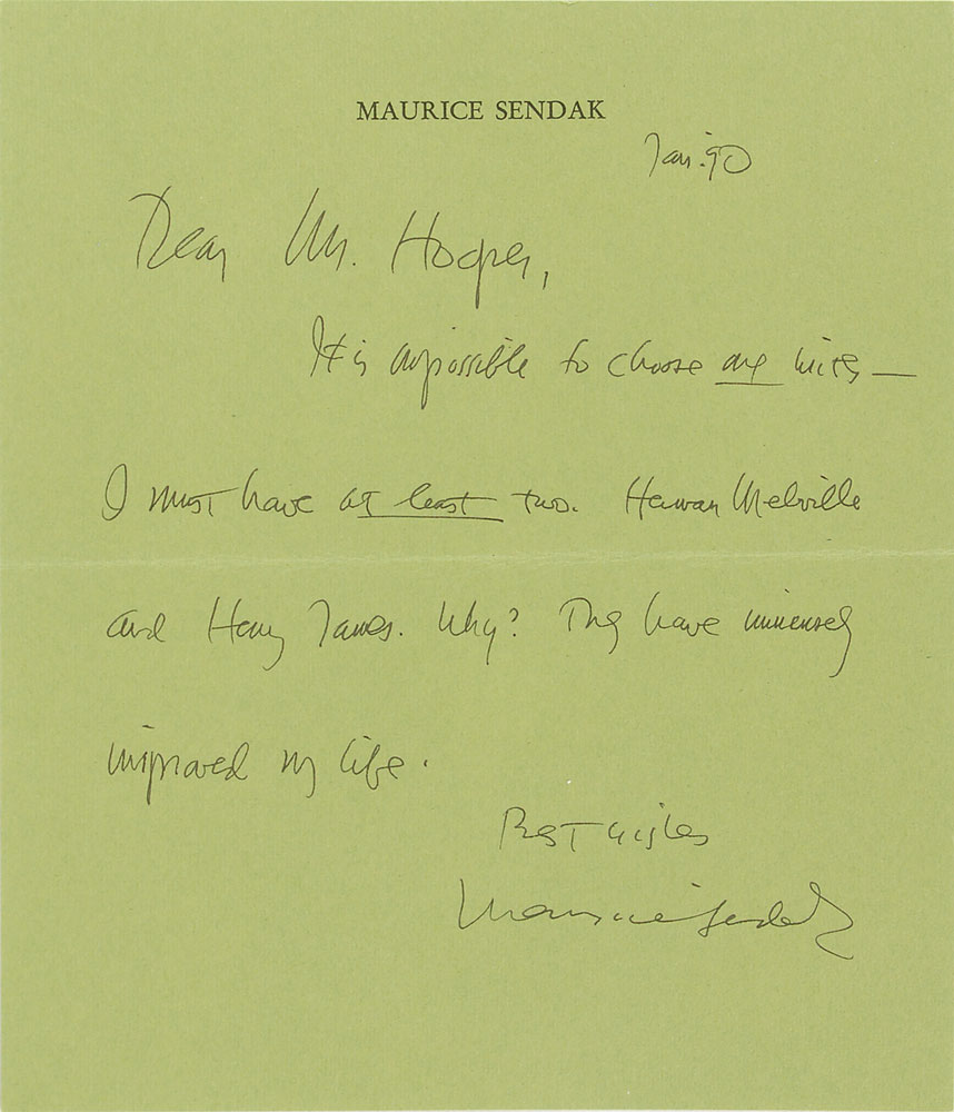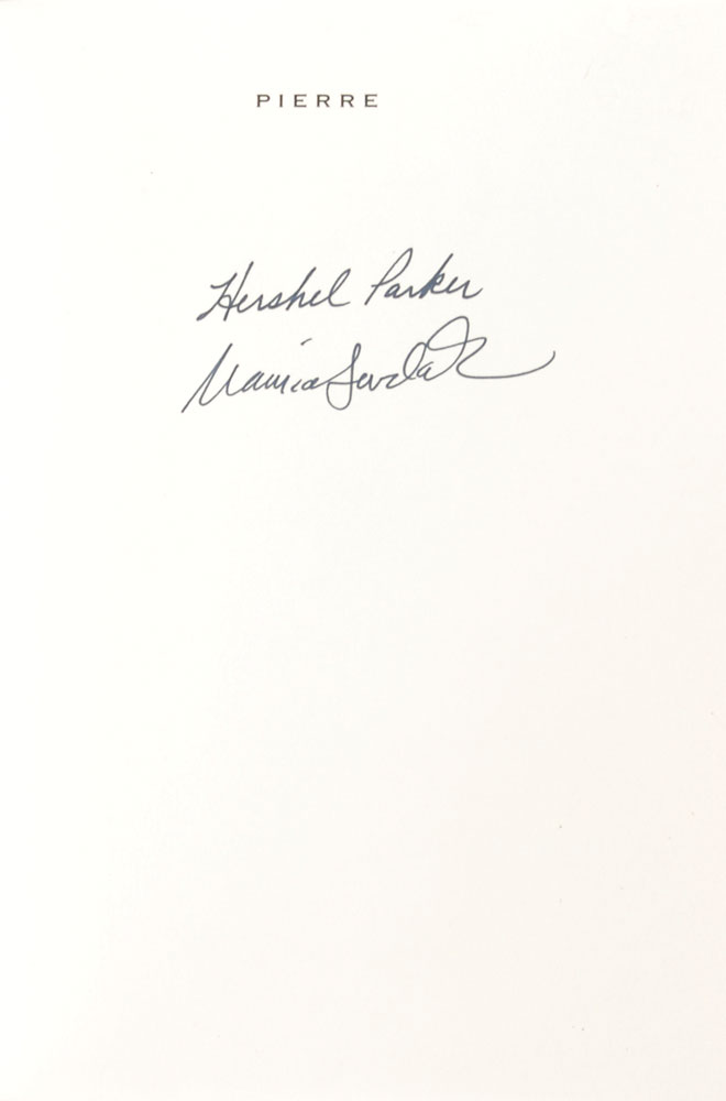 Two items: an edition of Herman Melville's Pierre or The Ambiguities, hardcover with dust jacket, signed on the half-title page in black felt tip by illustrator Maurice Sendak and editor Hershel Parker; and an ALS by Sendak, one page, January 1990, in full: "It's impossible to choose one writer. I must have at least two. Herman Melville and Henry James. Why? They have immensely improved my life." In overall fine condition.