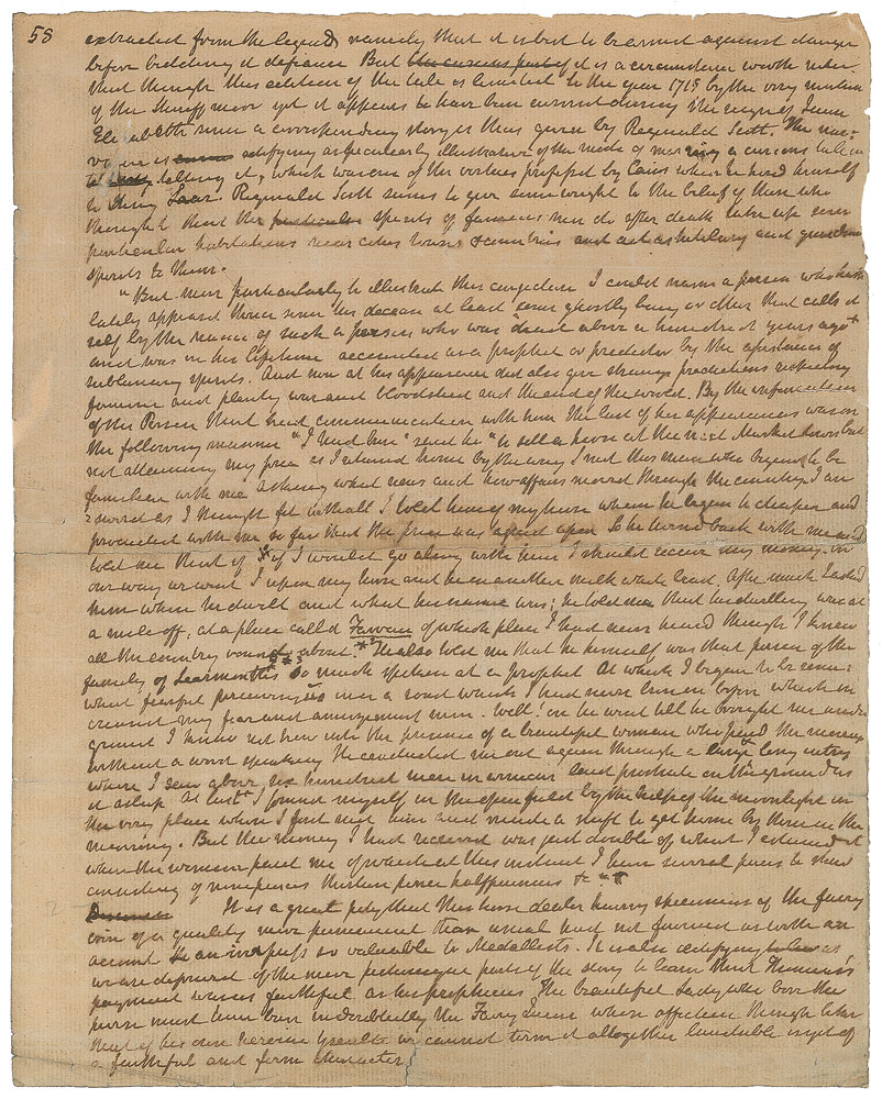Handwritten manuscript fragment, unsigned, one page, 8 x 10, no date but circa 1830. A page from the draft for Scott’s Letters on Demonology and Witchcraft, beginning with a passage about a story “given by Reginald Scot.” In part: “The narrative is edifying, as peculiarly illustrative of the mode of marring a curious tale in telling it, which was one of the virtues professed by Caius when he hired himself to King Lear. Reginald Scott seems to give some weight to the belief of those who thought that the spirits of famous men do after death take up some particular habitations near cities, towns & countries, and act as tutelary and guardian spirits to them.” In very good condition, with several professional repairs to total separations on reverse, uniform overall toning and some light wrinkling. Scott had been fascinated with demonology and witchcraft since childhood and over the years he tirelessly researched and read about the subjects. Surveying opinions respecting demonology and witchcraft from the Old Testament period to his own day, Scott’s Letters on Demonology and Witchcraft became an overwhelming commercial success. Pre-certified PSA/DNA.