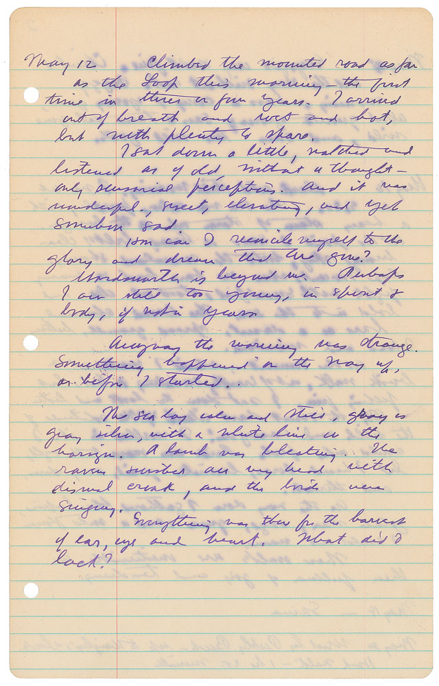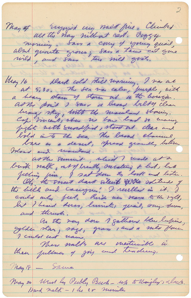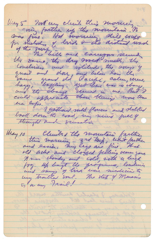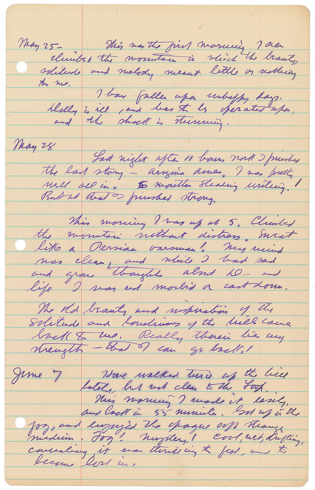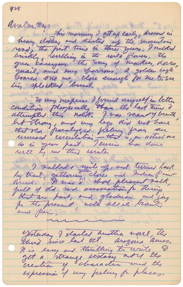 A section of one of Grey’s diaries, five pages on three sheets, 6 x 9.5, chronicling May 3 to June 7, 1928. Grey describes numerous hikes at length and mentions beginning a new book. In part: “This morning I got up early, dressed in heavy clothes, and started up the mountain road, the first time in three years…A golden eagle soared over me, close enough for me to see his speckled breast…Yesterday I started another novel, the third since last Oct. Arizona Ames. It is easy and thrilling to write. I get a strange ecstasy about the creation of characters and the expression of my feeling for places.” In overall fine condition.