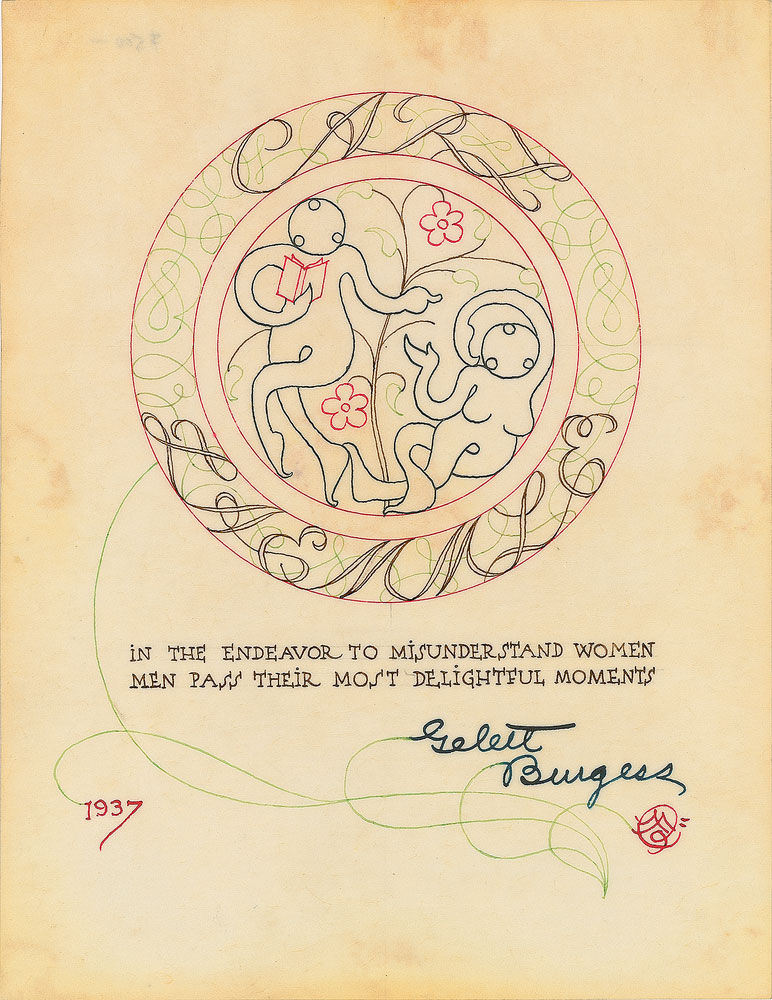 Artist, poet, and humorist (1866-1951) who was an early supporter of modern art in America. Original pen and ink line drawing of a man reading a book next to a woman on an off-white 7 x 9 vellum sheet, captioned, "In the endeavor to misunderstand women men pass their most delightful moments," signed below, "Gelett Burgess, 1937." In fine condition.
