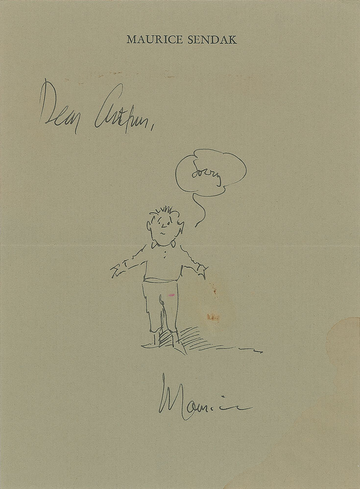 Original signed ink sketch of a young boy with his arms out saying "Sorry" on a tan 5 x 7 sheet of personal letterhead, inscribed above, "Dear Arthur," and signed below, "Maurice." In very good to fine condition, with a central horizontal mailing fold, and light staining to the right of the sketch and to the lower right corner area.