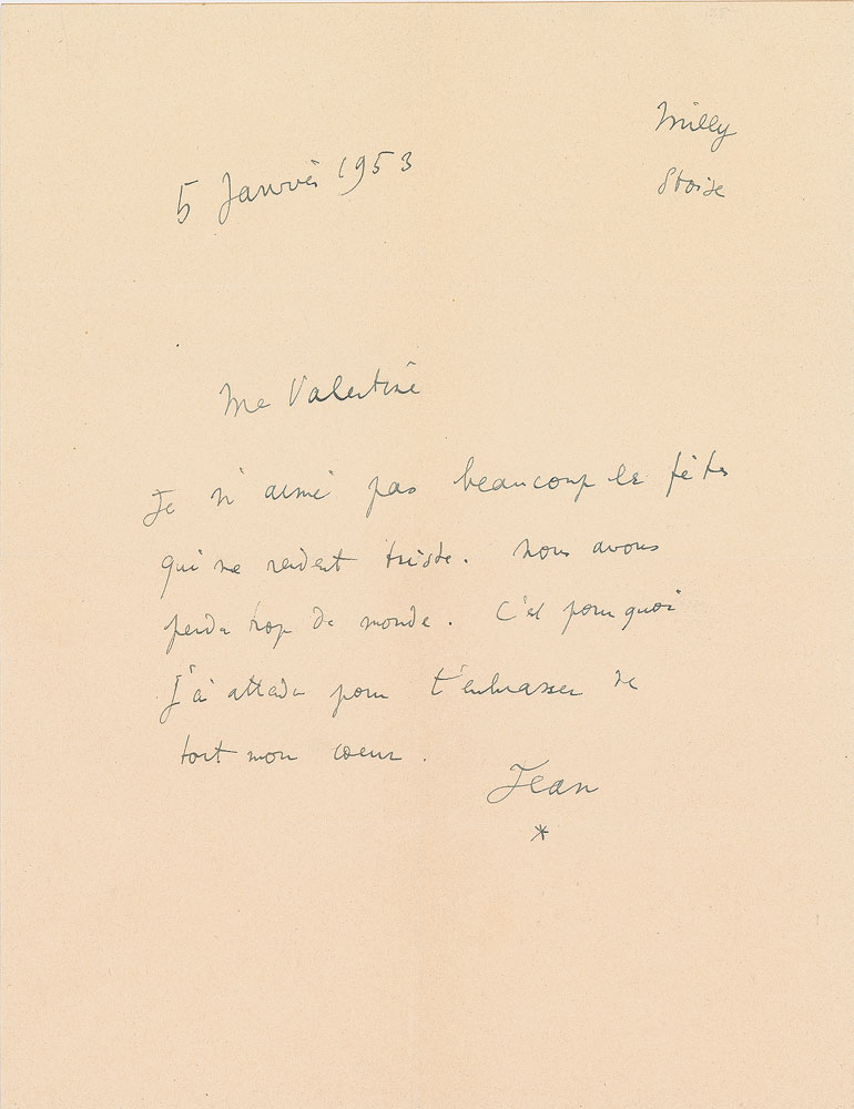 ALS in French, signed “Jean,” one page, 8.25 x 10.75, January 5, 1953. Letter to “My Valentine,” in part [translated]: “I do not really like this celebration which makes me sad. We have lost too many people. This is why I’m waiting to embrace you with all my heart.” In fine condition. Pre-certified PSA/DNA.