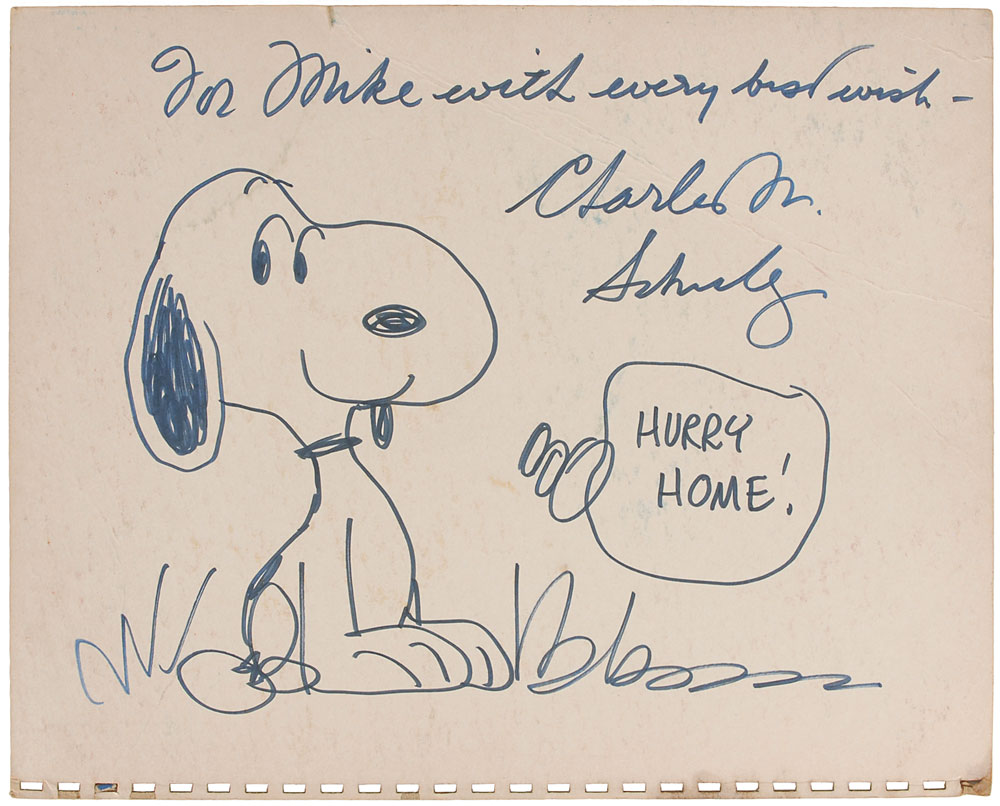 Large original signed felt tip sketch of Snoopy sitting in grass and saying “Hurry Home!” on an off-white 13 x 10.5 cardboard cover removed from a 1969 Peanuts datebook, signed and inscribed in black felt tip, “For Mike with every best wish—Charles M. Schulz.” In very good to fine condition, with overall light scuffing, and creases passing though the signature and inscription. Consignor notes that Schulz sent this sketch to a friend and neighbor of his who was serving in the Vietnam War. A wonderful example given its poignancy and impressive sketch. Pre-certified PSA/DNA.