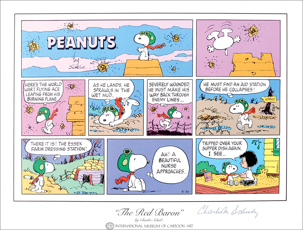 Color limited edition 18 x 13.5 lithograph of a nine-panel color Peanuts Sunday comic strip entitled ‘The Red Baron,’ issued by the International Museum of Cartoon Art, numbered 132/200, and depicting Snoopy as a World War I ace after being shot down. Signed in the lower border in blue ballpoint, “Charles M. Schulz.” Matted to an overall size of 23 x 18.5. In fine condition.