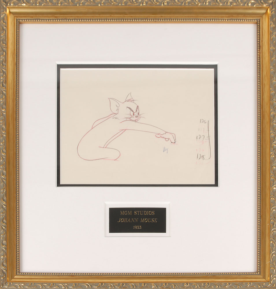 Original production drawing of Tom from the Tom and Jerry short ‘Johann Mouse,’ depicting the cat with an outstretched paw as he plays an unseen piano. Accomplished in graphite and colored pencil on off-white 9.5 x 7 animation paper. Image measures 6.25 x 4.25. Archivally double-matted and framed with an engraved plaque to an overall size of 17.25 x 17.75. In fine condition. In 1952, ‘Johann Mouse’ earned an Academy Award for Best Animated Short Film.