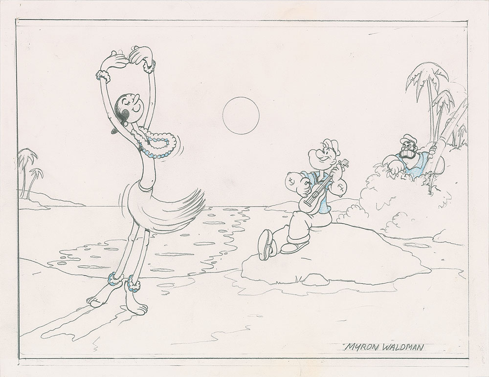 Original graphite and colored pencil master drawing for the hand-painted cel ‘Dancing on the Beach,’ showing a beach scene in which Popeye serenades a hula-dancing Olive Oyl as a jealous Bluto looks on from nearby bushes, accomplished by Waldman on an off-white 13.25 x 10 sheet of illustration paper, signed along the bottom in pencil. Includes the original hand-painted cel set against a matching color copy background. In fine condition. Pre-certified PSA/DNA.