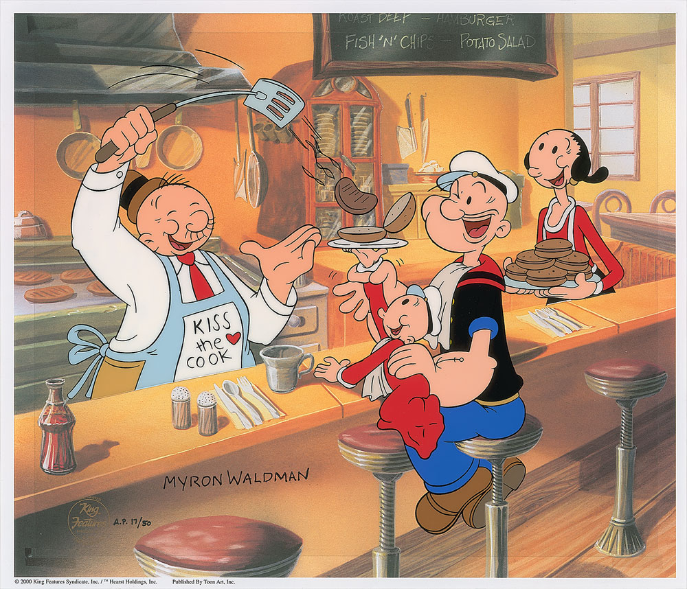 Limited edition original hand-painted animation cel entitled ‘Orders Up,’ 12.5 x 10.5, numbered AP 17/50, depicting Popeye and Swee’ Pea awaiting freshly grilled hamburgers from Wimpy and Olive Oyl. Signed in black ink by Waldman and set against a pre-printed background. Cel bears a 2000 King Features limited edition gold stamp. In fine condition. Pre-certified PSA/DNA.