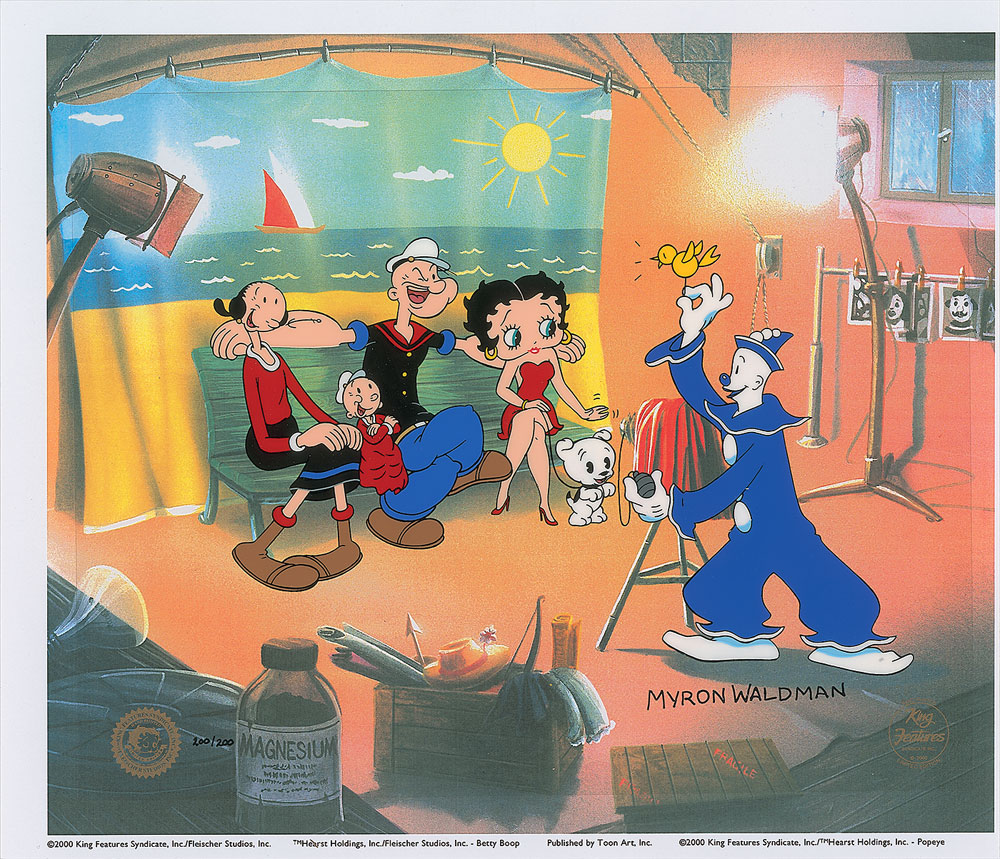 Limited edition original hand-painted animation cel entitled ‘Photo Op,’ 12.5 x 9.75, numbered 200/200, showing Koko the Clown preparing to take a photo of Popeye, Olive Oyl, Swee’ Pea, Betty Boop, and her dog Pudgy, against a sunny beach backdrop. Signed in black ink by Waldman and set against a pre-printed background. Cel bears a 2000 King Features limited edition gold stamp and a Fleischer Studio gold stamp. In fine condition. Pre-certified PSA/DNA.