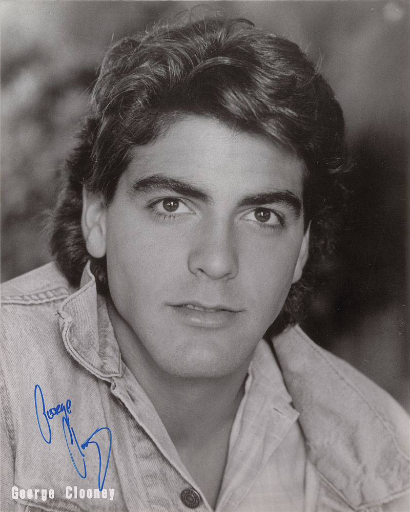 Arresting satin-finish 8 x 10 early publicity portrait of a young Clooney, signed in blue felt tip. In fine condition, with two staple holes to top edge. Pre-certified PSA/DNA. From the Harvey and Rhoda Kuflik Collection.