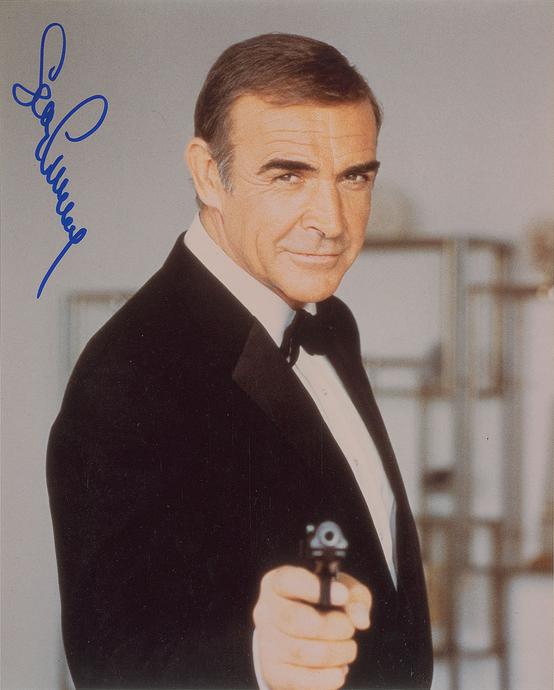 Exceptional color glossy 8 x 10 photo of Connery as the debonair secret agent James Bond, signed in blue felt tip. In very fine condition. Pre-certified PSA/DNA. From the Harvey and Rhoda Kuflik Collection.