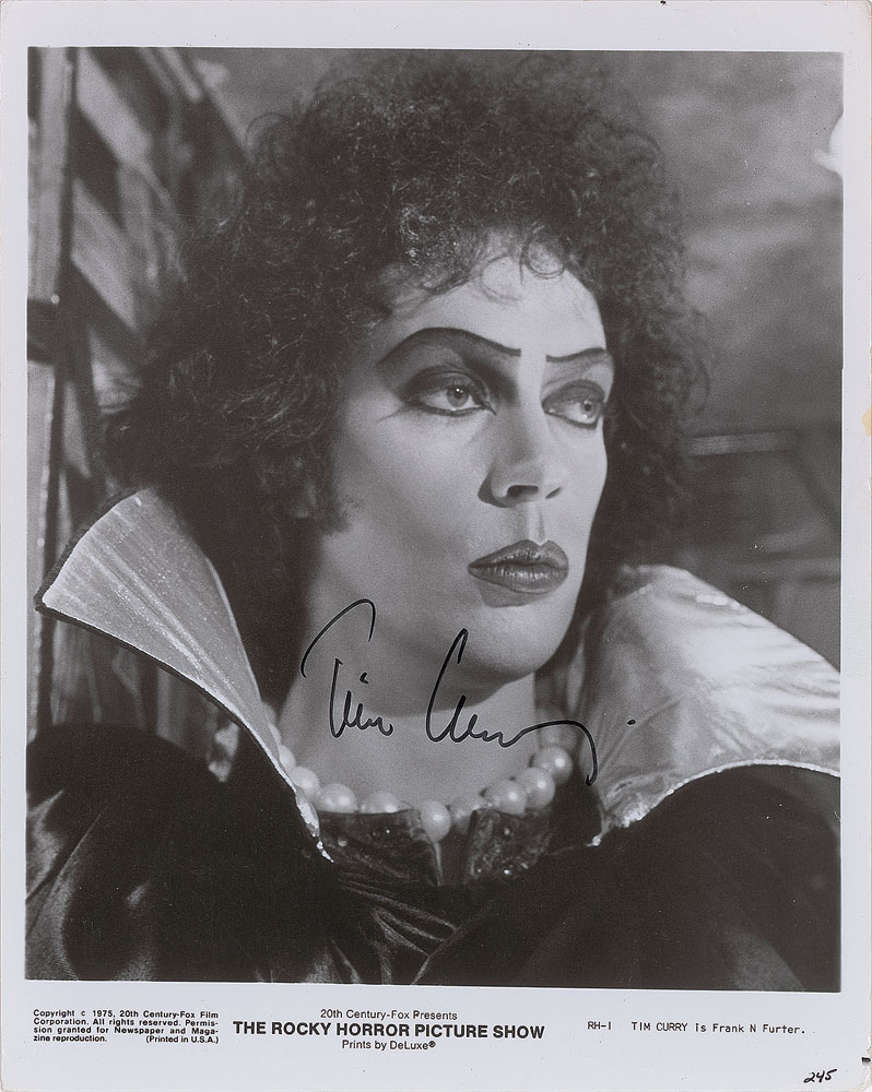 Sensational glossy 8 x 10 20th Century-Fox publicity photo of Curry as Dr. Frank-N-Furter from the 1975 film The Rocky Horror Picture Show, signed in black felt tip. In fine condition. Pre-certified PSA/DNA. From the Harvey and Rhoda Kuflik Collection.